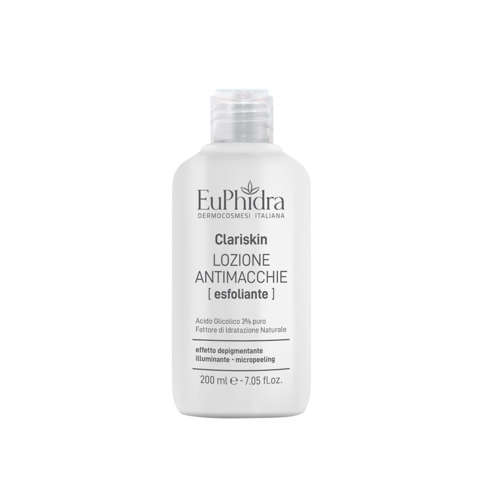 EuPhidra Clariskin lozione antimacchie esfoliante è un tonico, fresco e leggero che promuove il rinnovamento cellulare.